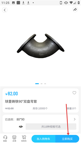4、在【球墨铸铁90°双盘弯管】商品详情页面点击【立即购买】按钮,可启动该商品的购买流程。