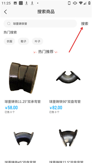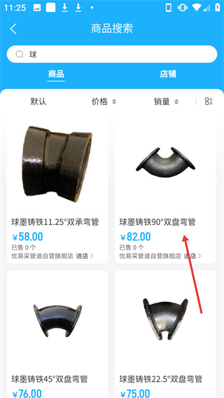 3、在商品搜索结果页面点击【球墨铸铁90°双盘弯管】商品项,可进入其详情页面。