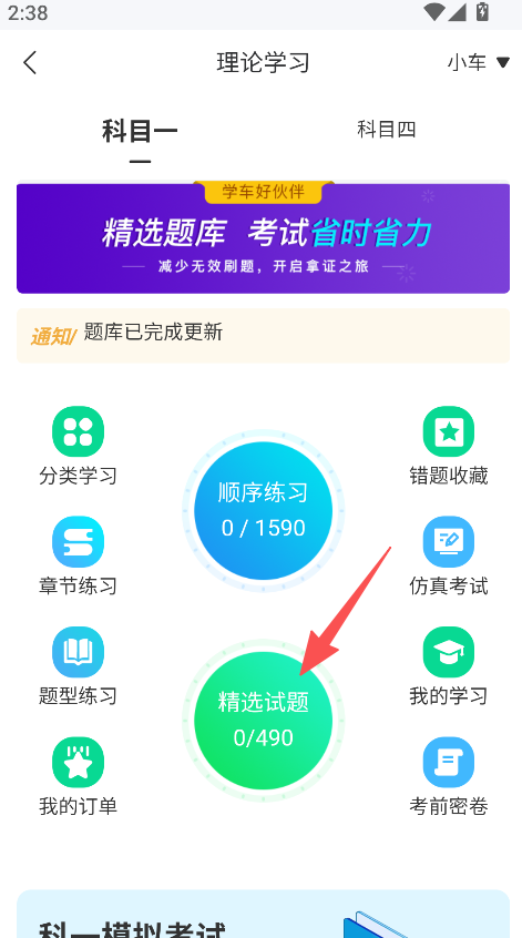 1、聚焦驾考理论学习设学习类型选择,分科目一科目四板块,提供精选题库,适配驾考理论的专项学习需求。