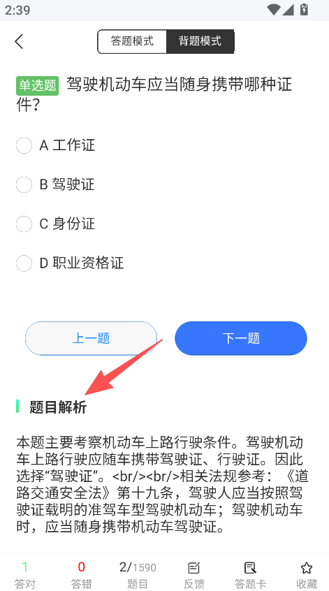 3、提供题目解析功能,在答题页面查看题目对应的考察点、相关法规等解析内容。