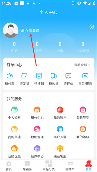 2、在【个人中心】页面点击【请点击登录】区域,进入登录页面。
