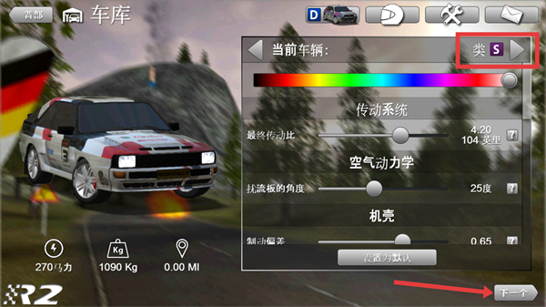 3、切换至S类车辆后,再点【下一个】将会返回主界面。