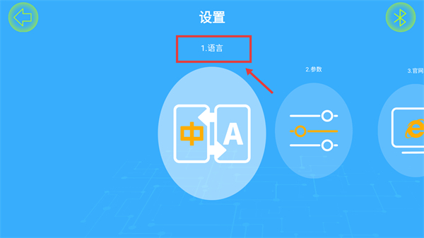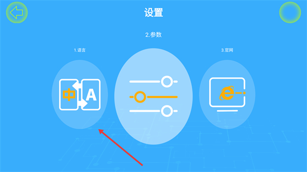 2、进入【设置】页面,能看到【语言】【参数】【官网】功能选项,这些选项可支持对应功能的设置操作。