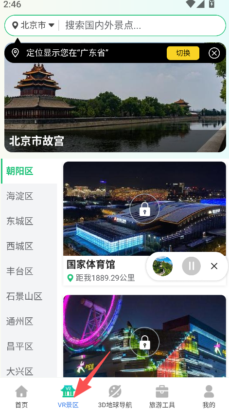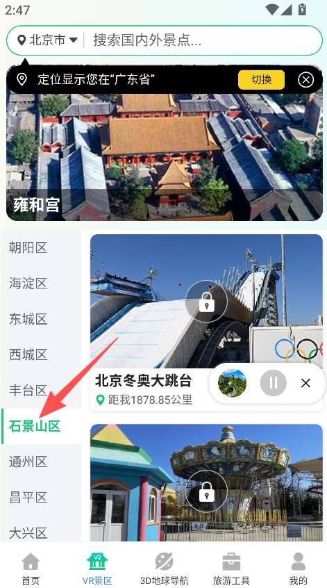 2、设有定位切换功能,调整当前定位地区,查看对应区域的景点资源及VR全景内容。
