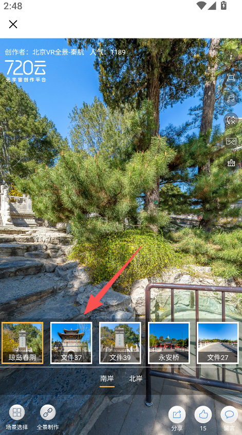3、提供VR场景切换功能,在景点VR页面,选择南岸、北岸等场景,查看景点的不同视角内容。
