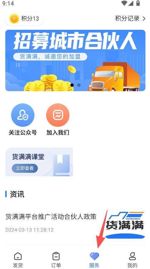 《货满满货主端》是一款货运服务类软件。设服务、发货、订单等板块,服务板块展示积分、招募城市合伙人信息,含关注公众号、加入我们等入口,设货满满课堂及资讯板块,资讯涵盖平台政策、诈骗提醒等内容,点击资讯可查看详情。适配货运相关的信息获取、服务参与需求。