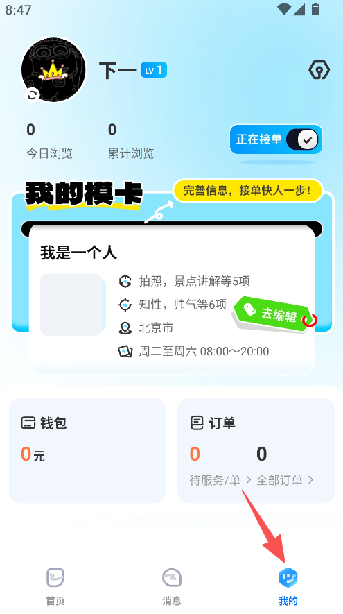 2、支持模卡管理功能,进入我的页面查看模卡,点击去编辑按钮完善服务项目、时间等信息。