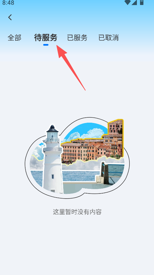 3、提供订单分类查看功能,在订单板块选择待服务分类,查看对应状态下的订单内容。