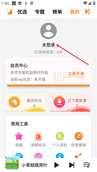 2、进入【我的】页面,显示【未登录】状态,点击登录。