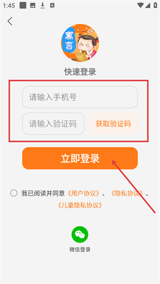 4、进入【快速登录】页面,填写【请输入手机号】【请输入验证码】,获取验证码后,勾选协议点击【立即登录】完成操作。