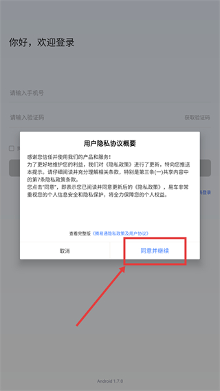 1、在登录页面弹出的【用户隐私协议概要】,点击【同意并继续】按钮,确认接受隐私政策。