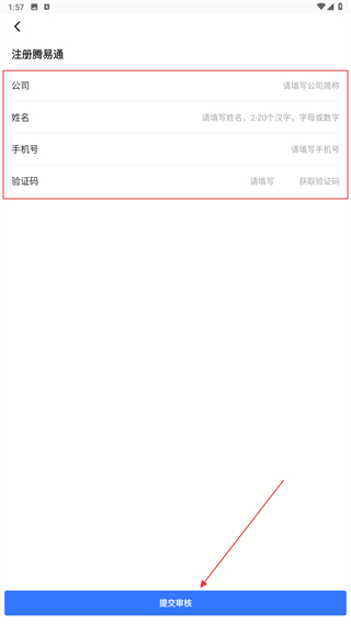 3、若需注册,进入【注册腾易通】页面,填写公司、姓名、手机号,获取并填入验证码后,点击【提交审核】完成注册申请。