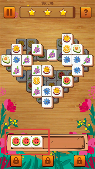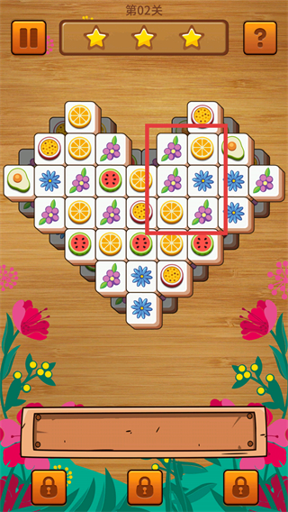 1、进入【第02关】,观察心形网格内的【水果-花朵方块】,选定目标方块准备匹配消除。