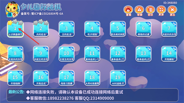 1、进入【少儿国际跳棋】主界面,点击【1-认识棋盘棋子】课程,即可进入该课的学习页面,开启对应内容的学习。