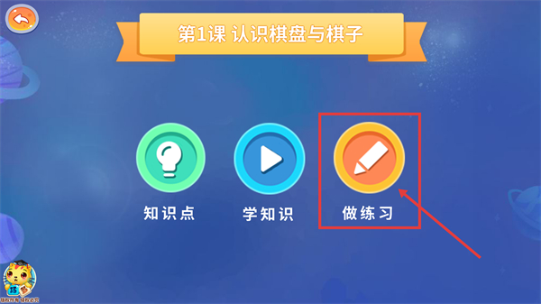 2、进入【第1课-认识棋盘与棋子】页面,点击【做练习】按钮,即可进入该课对应的练习题目环节,开始练习操作。