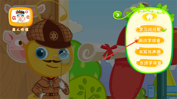 3、进入功能选择界面后,找到右侧的【游戏学拼音】选项并点击,进入对应的拼音游戏学习互动环节。