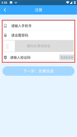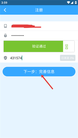 3、在注册页面填好信息、完成验证并输入验证码后,点击“【下一步:完善信息】”按钮,进入账号信息完善页面。