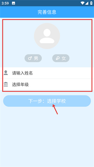 4、进入【完善信息】页面,需选择性别、填写姓名、选择年级,完成后点击“下一步:选择学校”按钮,继续完成注册。