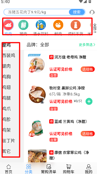 2、在分类页面选择所需商品,确认数量和规格,准备进行购买。