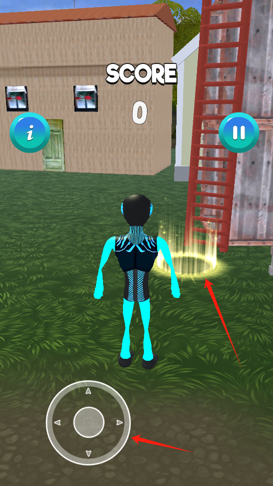 2、滑动左下角的轮盘控制角色,找到像这个发光的光环,角色会爬梯子上去。