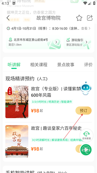 3、在景区详情页,找到对应讲解服务,点击【预订】进入服务详情页。