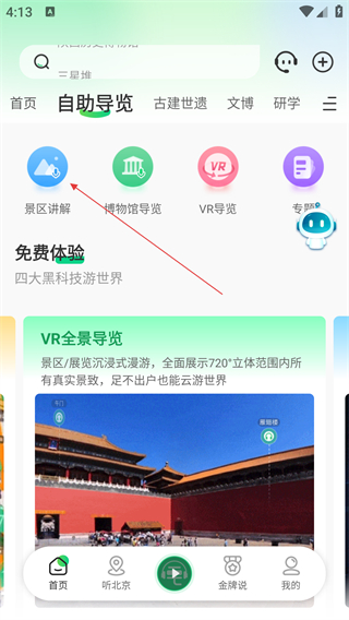 1、在自助导览页点击【景区讲解】,进入景区列表选择界面。