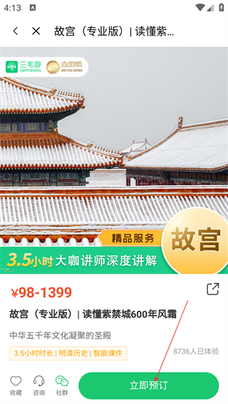 4、在服务详情页确认信息后,点击【立即预订】完成讲解服务的预订。