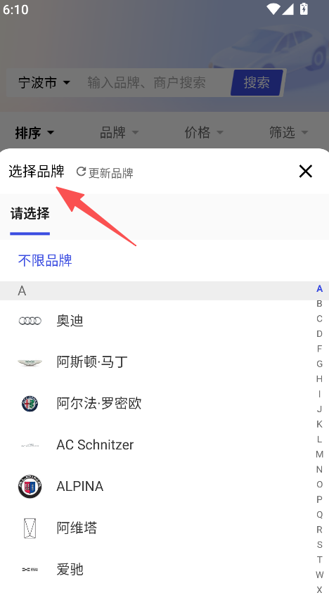 2、在车源广场页面,选择品牌筛选对应车源。