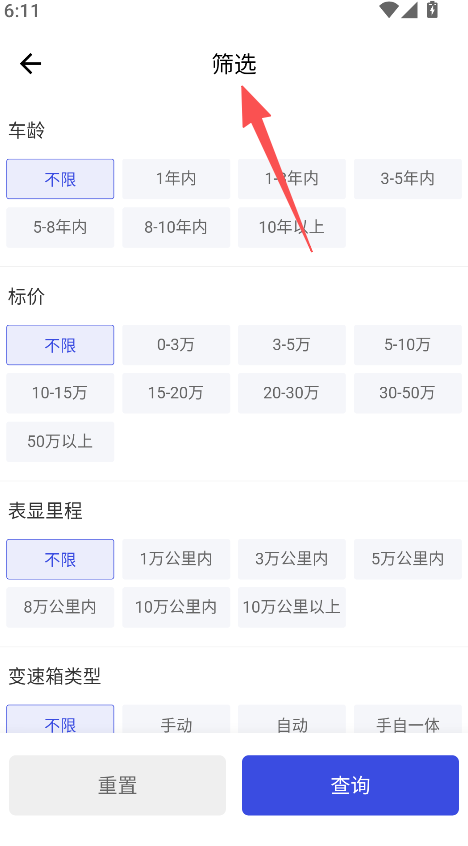 3、进入筛选页面,选择车龄等条件后查询车源。