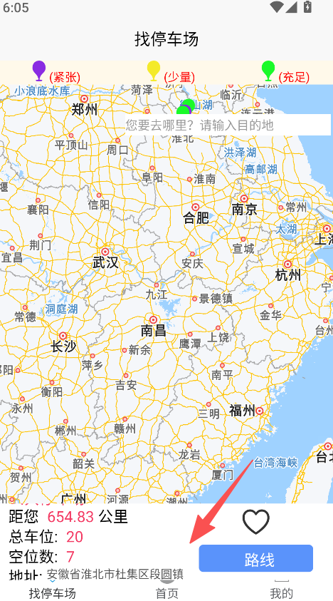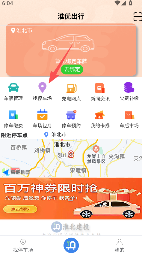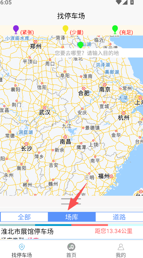 1、提供找停车场功能,进入对应页面,切换场库道路类型查找淮北本地的目标停车场。