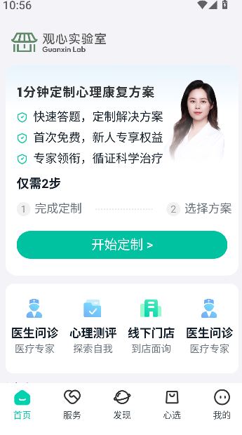 1、打开《观心实验室》,在首页导航中进入服务板块,查看各类心理训练与放松练习选项。