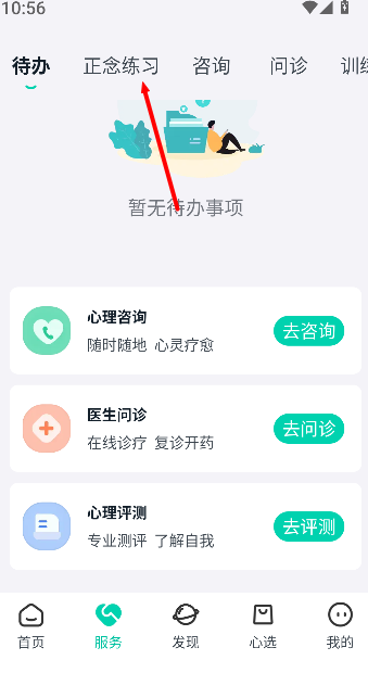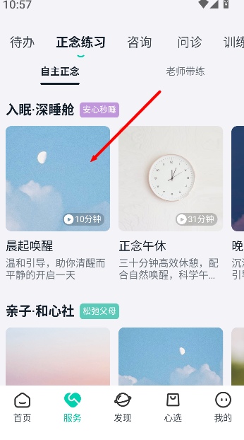 2、在服务板块中点击正念练习,进入正念训练界面,了解练习步骤与时间安排。