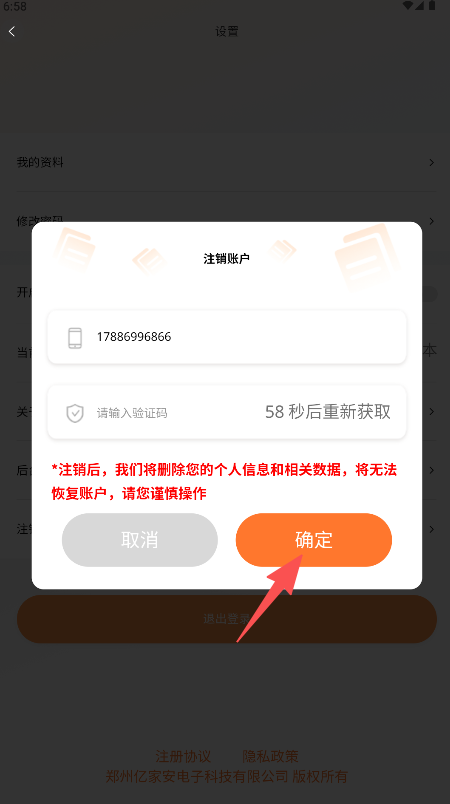 3、在弹出的“注销账户”窗口中,输入短信验证码后,点击“确定”按钮即可。
