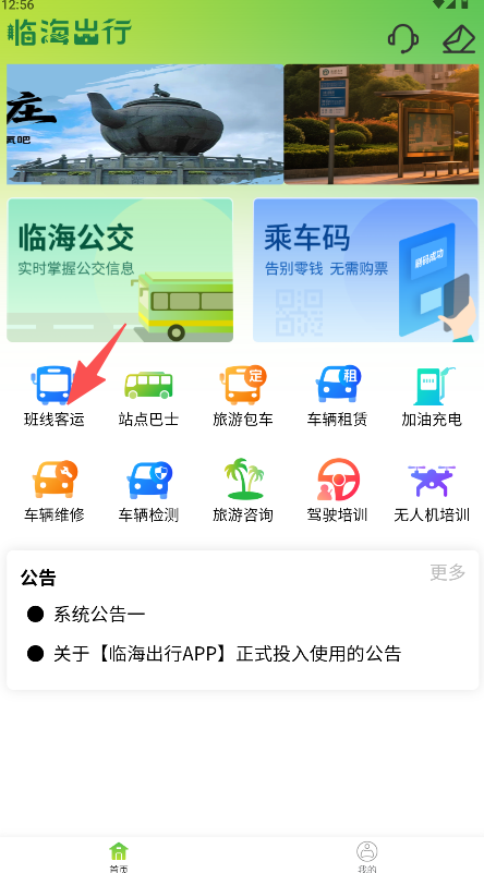 1、启动应用在首页功能区找到并点击“班车客运”。
