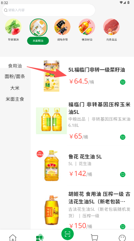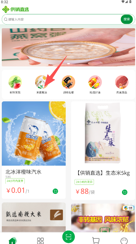 1、在软件首页的点击“米面粮油”图标。