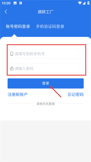 1、在【调研工厂】的账号密码登录页,填写【请填写您的手机号】与【请输入密码】,完成后点击【登录】按钮进入平台。