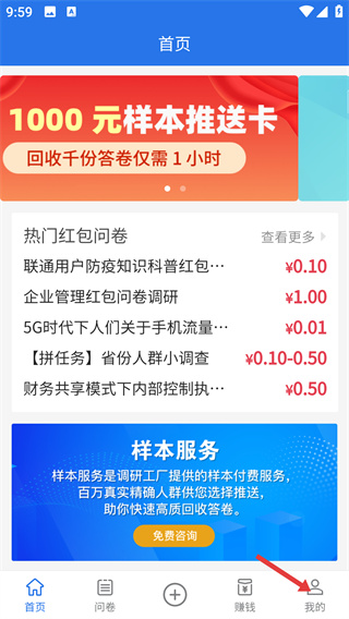 2、进入【调研工厂】首页,点击底部导航栏的【我的】选项,进入个人中心页面。