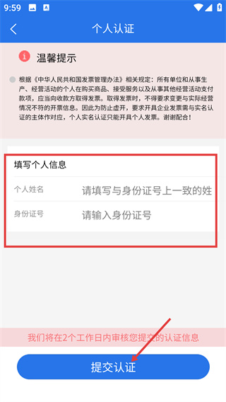 4、在【个人认证】页面,按提示填【个人姓名】、【身份证号】,留意温馨提示的开票规则,完成后点【提交认证】等审核。