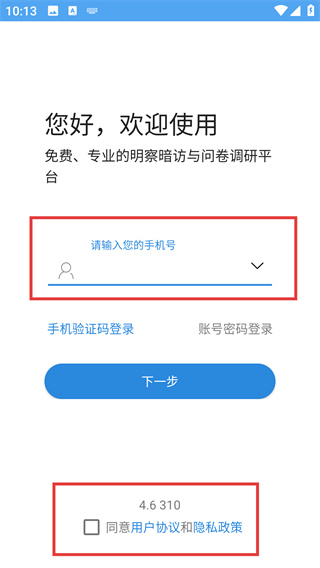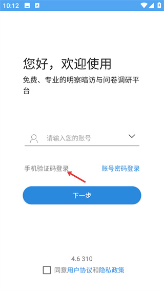 1、在调研平台的欢迎登录页,选择【手机验证码登录】方式,找到【请输入您的账号】输入框,准备后续信息填写。
