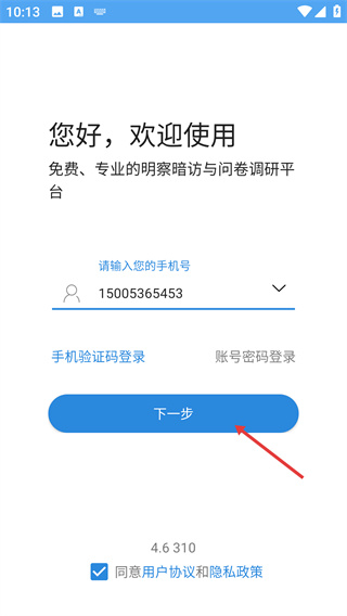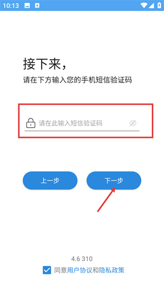 3、填好手机号并勾选协议后,点击【下一步】按钮,进入手机短信验证码的输入环节,推进登录流程。