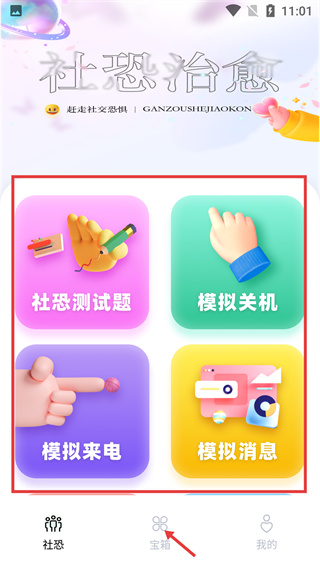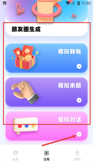 1、进入【社恐治愈】应用主界面,点击底部【宝箱】选项,切换至对应功能页,查看【朋友圈生成】相关模块。