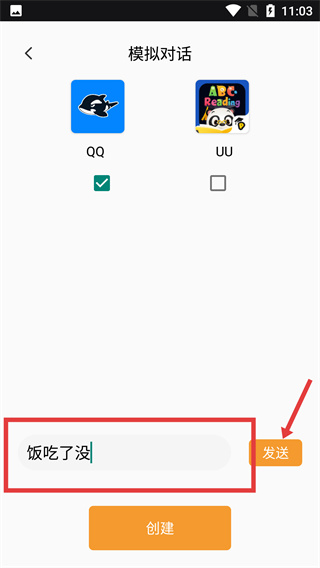 4、在【模拟对话】界面填好双方名字,在输入框写【吃饭了没】后,点击【发送】按钮生成模拟对话内容。