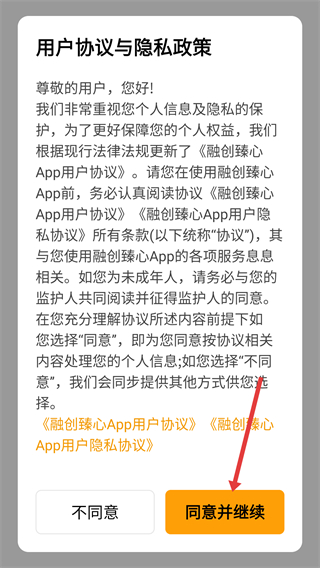 1、使用【融创臻心App】前,阅读【用户协议与隐私政策】及【融创臻心App用户协议】,点击【同意并继续】按钮进入登录环节。