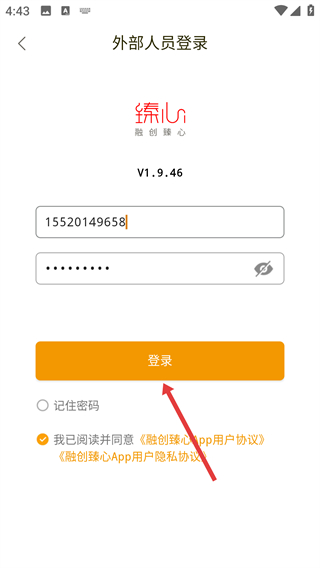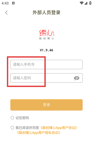 4、在【外部人员登录】页填好手机号与密码,勾选协议后,点击【登录】按钮完成外部人员账号登录。