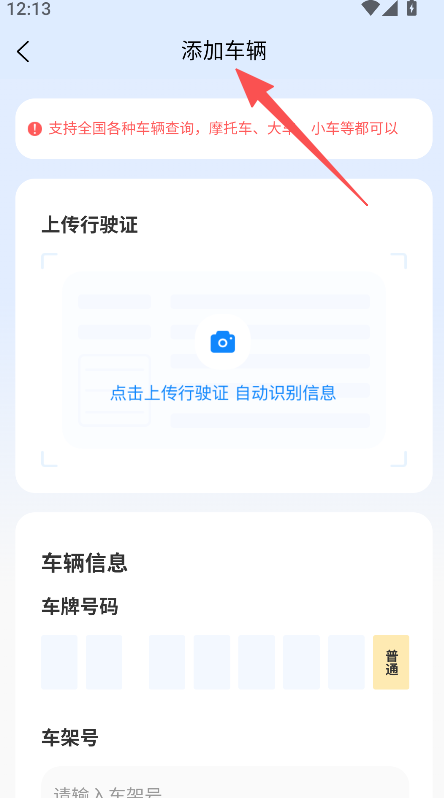 2、在添加车辆页面,上传行驶证自动识别信息填写车辆信息。