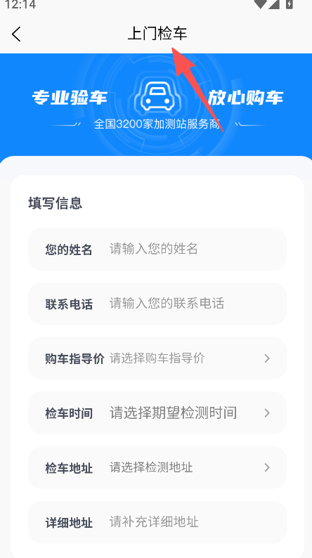 3、支持上门检车功能,填写信息选择时间地址,预约全国服务商提供的专业检车服务。