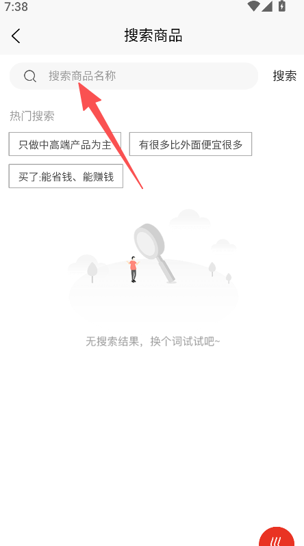 1、进入搜索商品页面,在搜索框输入商品名称后点击搜索。