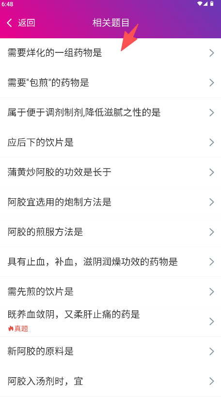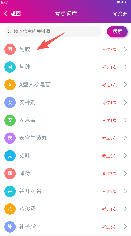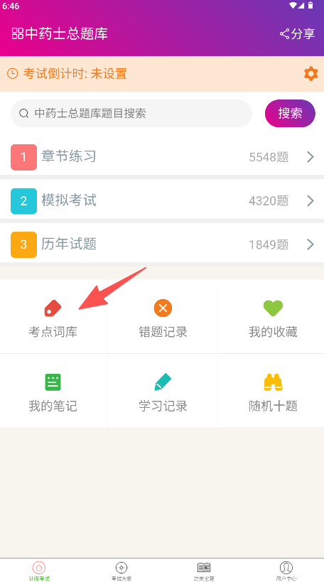 1、考点查询与真题关联,通过考点词库搜索具体中药学知识点,查看其考频并一键跳转至所有相关真题。
