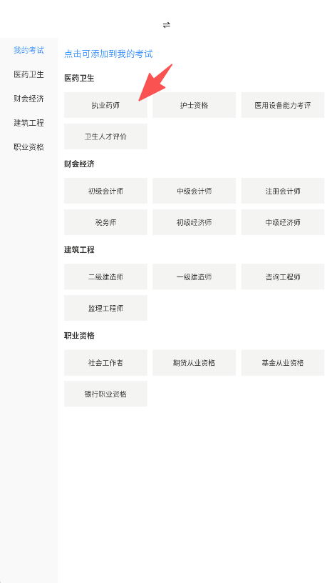 1、首页考试分类清晰直观,按医药卫生、建筑工程等大类排列,点击具体考试即可一键添加至个人列表。