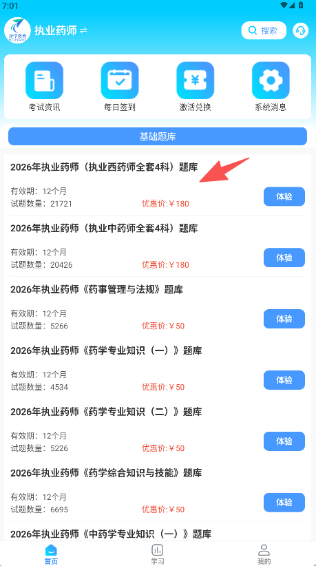 2、找到目标题库如“2026年执业药师(执业西药师全套4科)题库”点击进入。
